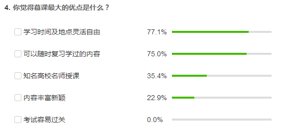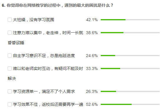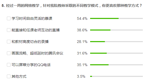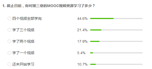 二是了解员工心理,更新教学设计。线上网络学习与线下课堂学习有着本质的区别,最大的一点就在于师生阻隔于屏幕两端,如何调动员工的积极性,变被动学习为主动学习,在学习效率不减、学习质量不降的前提下保障课程的顺利开展就成为最大的难题。为此,我充分发掘利用了中国大学MOOC 配套的微信小程序——慕课堂,在里面设计进行了多次问卷调查,了解员工对网络教学的认识,以及他们学的MOOC学习中遇到的最大难题。调查结果表明,大部分同学对开展网络教学还是非常认可和理解的,并且对MK体育的网络教学还是比较满意的,这让我松了一口气,对网络教学充满了信心。