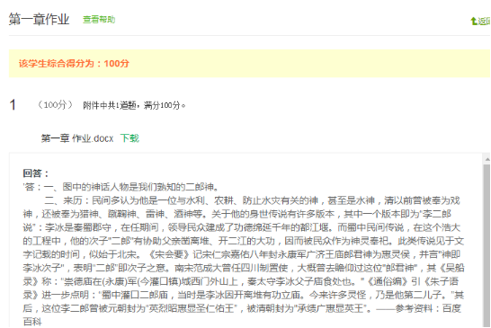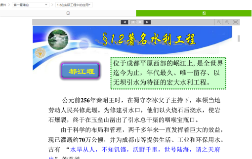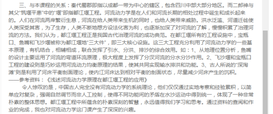 第一章是绪论,我仅设计了一道灵活的简答题,发放了两张“二郎神”的图片,让大家谈谈该神话人物与我们《河流动力学概论》课程的渊源,成功引起了大家的大家的好奇心,又适时上传了关于中国古代著名水利工程的PDF课件,让大家通过驰名古今中外的一些水利工程中发现,河流动力学的知识应用如此久远和广泛,既融入社会主义核心价值观,培养员工的家国情怀,激发员工作为新时代水利人的远大理想抱负,加强对行业的认同感,又为后续课程学习做好了铺垫。大家的答案五花八门,但看得出来,大家都进行一定程度上的资料检索查阅,绝大多数同学都能找到切入点,部分同学还对资料进行了加工整理,标注了参考文献,条理分明地完成了作业,明确指出“通过资料的查阅和作业的完成,我也对河流动力学这门课产生了深深的兴趣。”